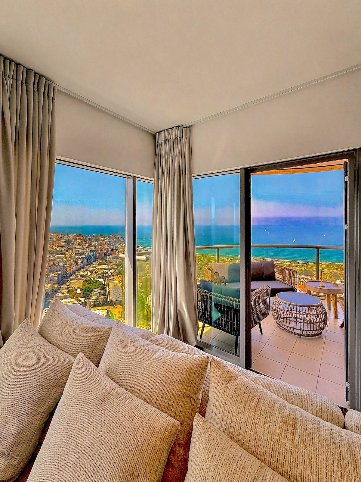 La întoarcerea acasă de la Banana Beach sau de la piața Carmel, fiecare la 2 minute de mers pe jos, cu sacoșele/costumele de baie, intri în apartamentul tău cu vedere la mare, îți atârni lucrurile ude pe balcon sau în dușul din baia de piatră. Fă un duș fierbinte, apoi savurează puțin vin, ridică-ți picioarele pe terasă sau în dormitor sau vizionează filmele preferate pe ecranul lat HD sau în televizorul din dormitor. Sunetele nocturne pe care le auziți de la etajul 6 sunt valurile.