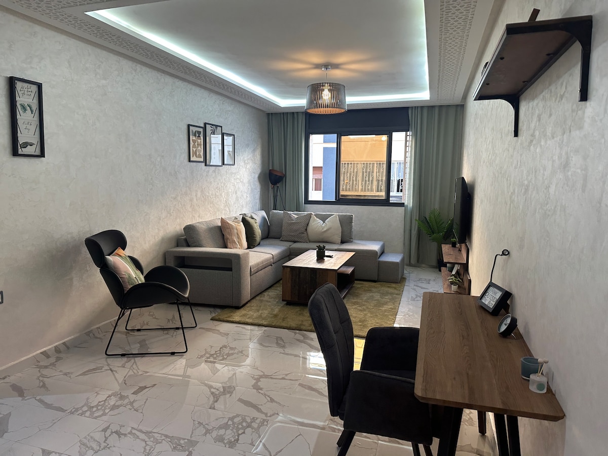 Appartement lumineux, chaleureux et confortable, idéal pour se détendre après une journée bien remplie. Grand salon avec matelas moelleux, cuisine équipée, chambre douillette et TV, Fibre Optique, NETFLIX. Situé dans un quartier calme, l'appartement est proche de toute commodité : centre ville, commerces, transports, marina, monuments. Parfait pour professionnels, familles, couples ( mariés pour les marocains) . Vous vous sentirez chez vous dès votre arrivée !