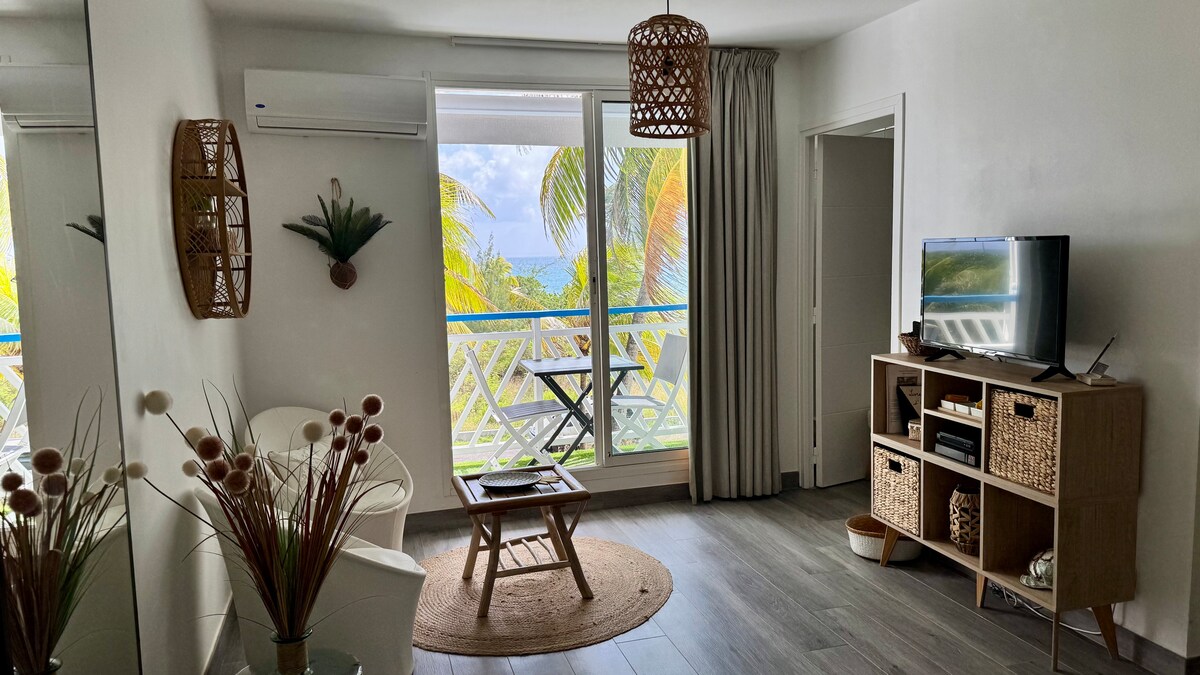 75 m 2 apartament refăcut cu vedere la mare în reședința plajei de cristal din Saint François . - reședința are 2 piscine cu acces direct la plaja limpede cu struguri. - un parc frumos, liniștit, împădurit și intrare securizată, cu mall ( brutărie,supermarket,restaurante și fast-food,coafor, salon de masaj etc. ) apartamentul este format din: -2 camere spațioase și cu aer condiționat - bucătărie modernă - Duș italian - Rezervor de apă - Wi-Fi - parcare numerotată
