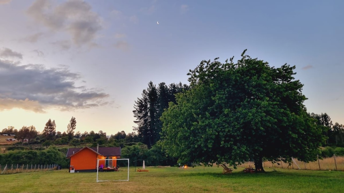 Relaxează-te cu întreaga familie în această locuință, înconjurată de natură, calm și siguranță. Avem spații ample în interiorul și în afara cabanelor, terasă acoperită, terasă și parcare. Atmosferă de familie Grato. Situat la 15 minute de lacul de mers pe jos, la 4 minute de sat cu mașina, foarte aproape de priveliști incredibile, cascade și râuri. Îndrăznește să te bucuri de o experiență unică într-unul dintre cele mai frumoase lacuri din Chile.