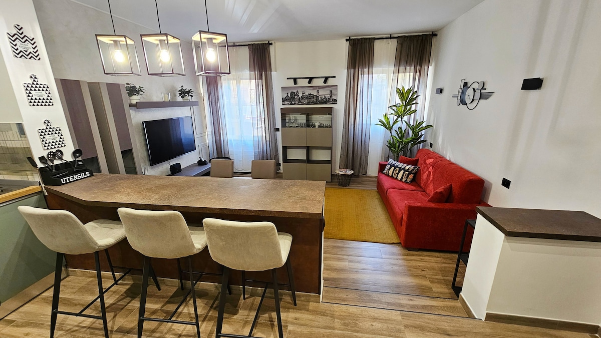 ADAMARE este proiectul nostru de vacanță conceput pentru tine: un apartament primitor, recent renovat;modern,funcțional și, îndrăznesc să o spunem: de asemenea, foarte drăguț!Adamare este un apartament de artă, deoarece spațiul, cu atenție la detalii și combinații de culori, prezintă o selecție plăcută de grafică și picturi pe pereți. De pe terasa din living, unde veți găsi o masă pentru o cafea în aer liber, un măslin iese în față și puteți vedea verdeața bine întreținută și înflorită a balcoanelor din jur