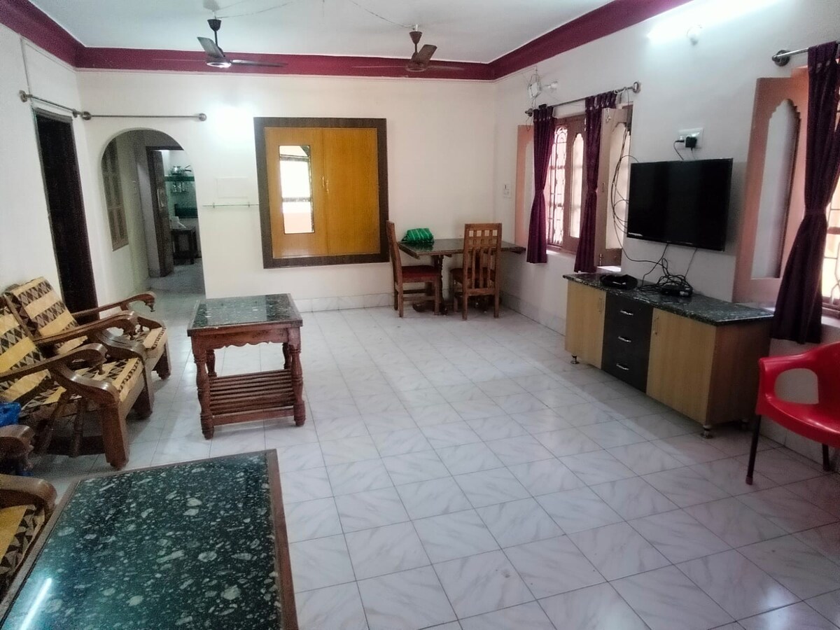 Adu întreaga familie în acest loc minunat și bucură-te de o ședere liniștită. Apartamentul 2 BHK este complet mobilat, cu living confortabil dotat cu canapea, măsuță de cafea și TV pentru divertisment. Zona de luat masa include o masă lângă o bucătărie bine echipată, inclusiv un frigider și aragaz. Dormitorul este un pat matrimonial spațios, un dulap și un pat suplimentar de o persoană, ceea ce îl face ideal pentru familii. Spațiul are, de asemenea, AC, alimentare cu apă RO și rezervă de energie UPS