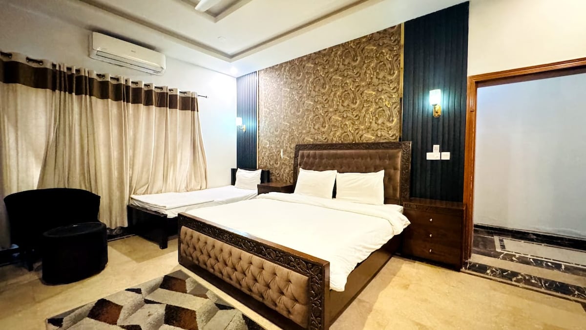 Casă spațioasă, modernă, elegantă și nou construită 2 dormitoare, 3 băi, bucătărie, spălătorie, living etc. Perfect pentru cupluri, familii sau chiar profesioniști din domeniul afacerilor, oferind tot ce ai nevoie pentru o ședere relaxantă, memorabilă și plăcută. La doar 10 minute de Aeroportul Internațional Islamabad. Extrem de aproape de autostrăzile Lahore/Islamabad/Peshawar. Indiferent dacă explorezi minunile din zonele nordice sau ai nevoie de o escală relaxantă înainte de următorul zbor, îți va plăcea.