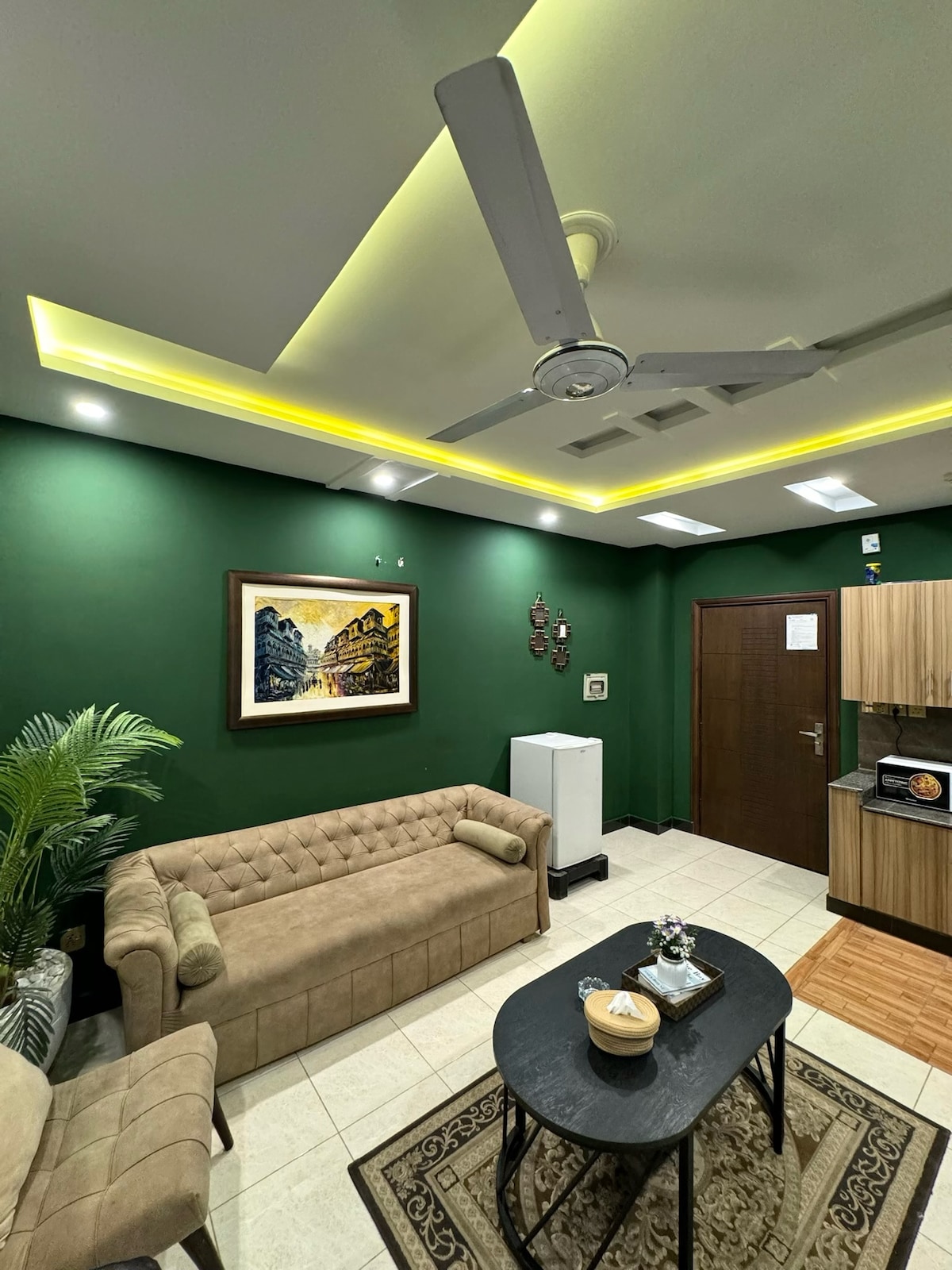 ✔️ Modern 1BHK în Bin Chiragh Heights, Bahria Town Faza 7 Tavan ✔️ unic înstelat cu tematică galaxie pentru nopți magice ✔️ Balcon + AC + TV inteligent de 65”(Netflix, Roku, Disney+) Wi-Fi ✔️ gratuit și parcare securizată gratuită/privată ✔️ Lângă Turnul Bahria Eiffel, Centrul Civic, Glow Park și cafenele ✔️ Perfect pentru cupluri, călătorii solo și șederi în interes de afaceri
