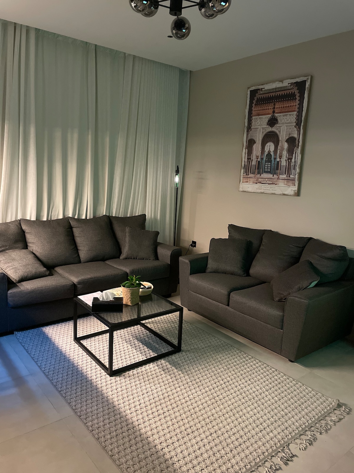 O unitate elegantă, cu o notă modernă și culori calde, cu un dormitor și un lounge cu o ambianță confortabilă și aer condiționat liniștit. Include abonament IPTV, YouTube și Netflix. Situat într-o locație plină de viață, aproape de toate locurile și serviciile de agrement, fiind ideal pentru cazare confortabilă și navetă ușoară. 📍 Poziție: Poziția apartamentului este ideală și aproape de cele mai importante obiective turistice ale orașului: • 🛍️ 5 minute până la Al Salam Mall și Al Andalus Mall • 🏥 Aproape de Spitalul East Jeddah și de Sulaiman Al Habib • 🚆 Lângă gara Al-Haramain • 🛫 La 15 minute de aeroport • 🌊 La 15 minute de Corniche • 🏫 5 minute până la Universitatea King Abdulaziz