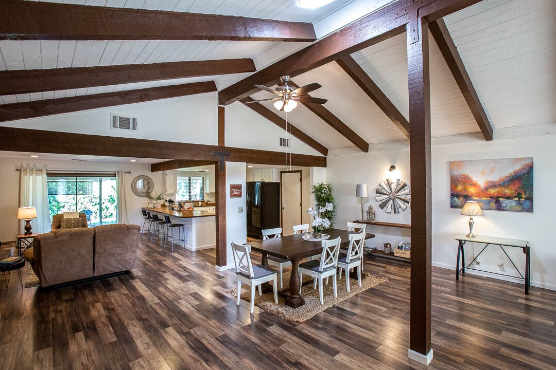 Make this newly remodeled upscale modern getaway your home base for Northern California adventures! You'll be delighted to return to its charming comforts and designer furnishings after your daily adventures. A slanted roof with exposed wood beams opens up the living area with a fireplace, while the open-concept floor plan allows natural light to spread throughout the whole room. The pristine home is surrounded by opportunities for outdoor recreation and close enough to walk to Bethel Church.