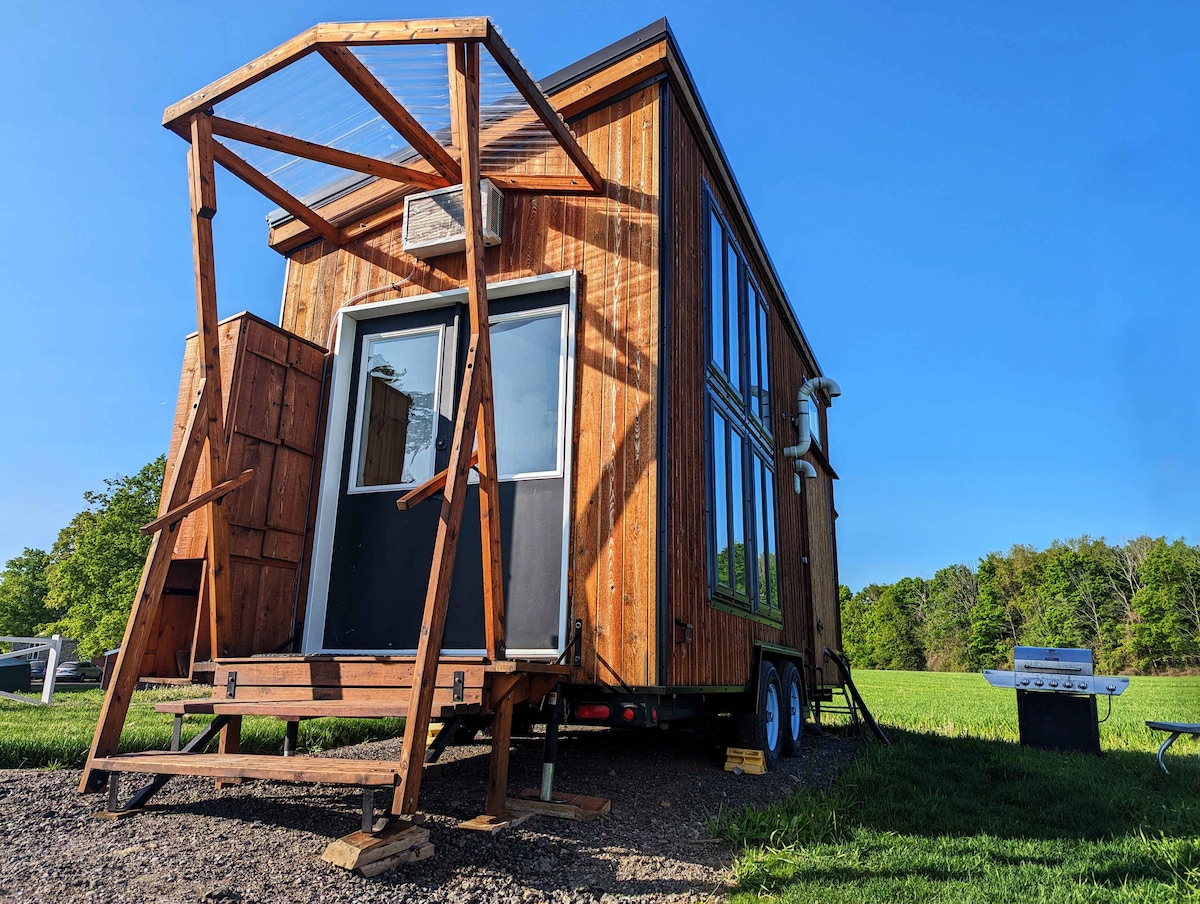 Evadare la țară – un refugiu atent amenajat Experimentează amestecul perfect de confort și sustenabilitate în această escapadă frumos amenajată, creată ca un experiment de viață în afara rețelei. Caracteristici: Bucătărie (plită, cuptor de perete, chiuvetă dublă și frigider) Baie completă cu duș din cedru, chiuvetă, toaletă interioară cu COMPOST INTERIOR Mașină de spălat, încălzire radiantă și aer condiționat pentru confort pe tot parcursul anului King Loft și luminator pentru observarea magică a stelelor
