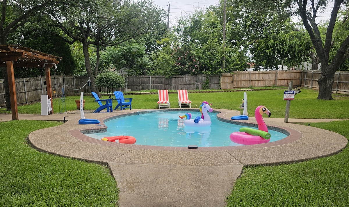 Evadează în paradisul nostru confortabil între FW și Dallas, la doar 7 mile de centrul orașului FW și la 11 mile de stadionul ATT. Explorează restaurantele,magazinele din apropiere și NE Mall. Fermecătoarea noastră casă promite o ședere confortabilă, cu o curte împrejmuită pentru prietenii tăi blănoși, o piscină primitoare și un grătar cu cărbuni pentru delicii la grătar. Distracția în interior include piscină pentru copii, mese de ping-pong și jocuri de masă. Dormitoarele și livingul au televizoare cu ecran plat. Bucură-te de internet WI-FI rapid. Rezervă-ți șederea acum și creează amintiri de durată