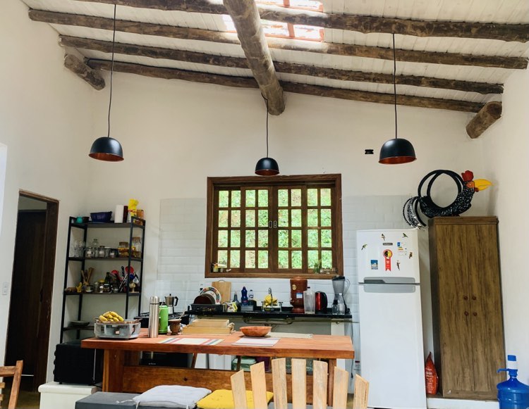 Cu vedere panoramică la Serra da Mantiqueira, pe malurile barajului Jaguari, cu picioare. Casa are două dormitoare, un apartament și altul cu baie, living integrat cu bucătărie complet utilată și șemineu. Bucătărie de țară pe balcon, cu aragaz cu lemne și cuptor, o sobă industrială cu vedere la pădure, bogată în păsări, o masă cu scaun, fotolii și o canapea în aer liber. Masă în curtea pavată exterioară - vedere la baraj și pădure - grătar portabil, hamac, bancă și scaune.