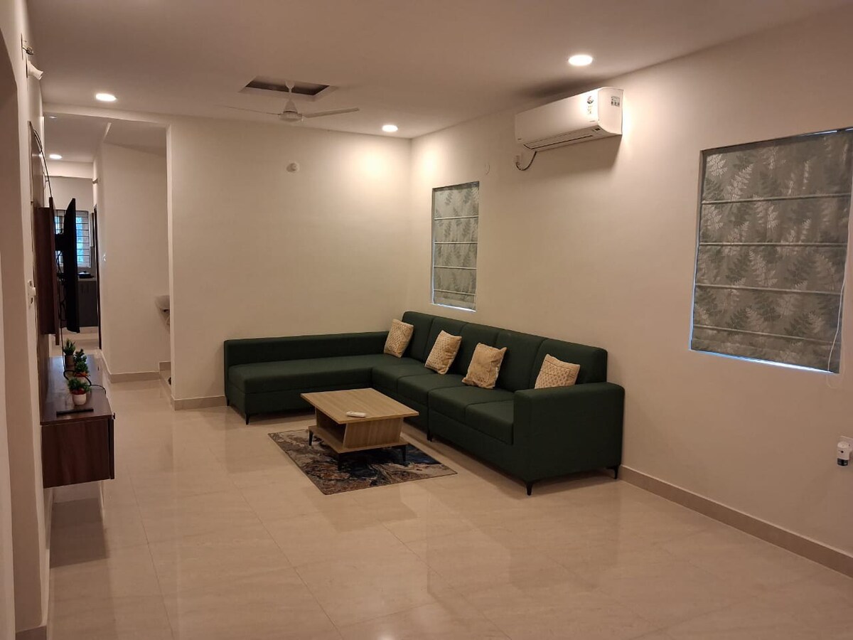 Bine ai venit în apartamentul nostru elegant cu 3 dormitoare, ideal pentru șederi de scurtă sau lungă durată. Bucură-te de 3 dormitoare cu aer condiționat și băi atașate, un living confortabil cu un televizor inteligent de 43", Wi-Fi de mare viteză și un leagăn interior. Bucătăria complet utilată include aragaz, cuptor cu microunde, purificator RO, frigider și ustensile. Situat convenabil în apropierea stației de metrou Hitech City, Usha Malpuri's Kitchen (100 m), US Visa Center (1 km), Podul de cablu și principalele centre IT.