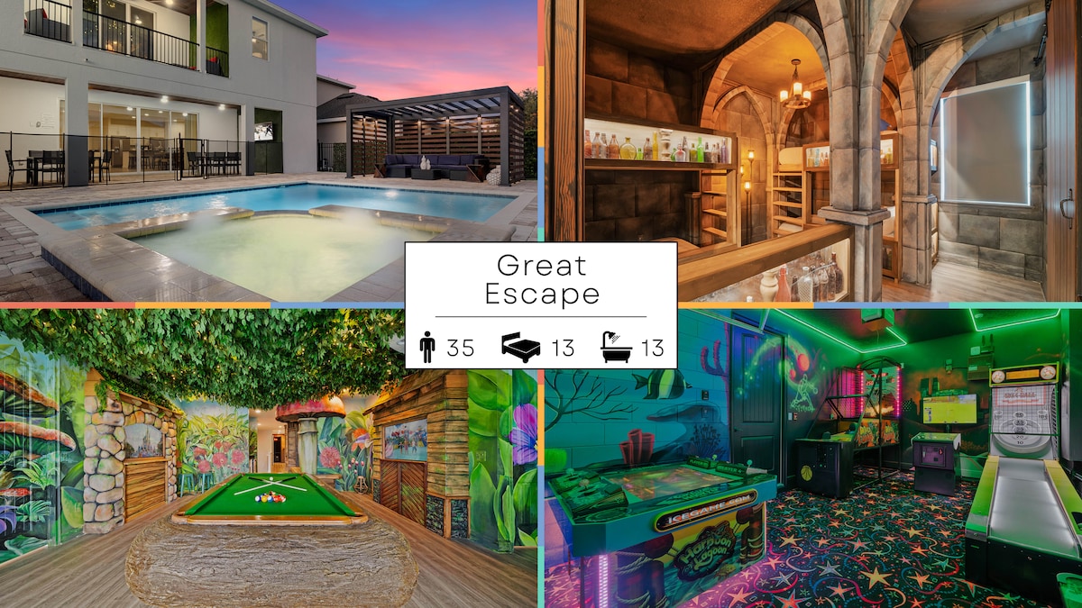 Acesta este locul! Nu mai căuta cea mai magică vacanță de vis captivantă! Bine ai venit în propria ta oază tropicală privată la câteva minute de Disney World! În Encore Resort by Reunion (comunitate închisă) bucurați-vă de piscina privată, cada cu hidromasaj/jacuzzi, leagănele hamacului, barul Tiki, experiența unică de minigolf. Iluminatul LED din curtea din spate și din întreaga casă te va uimi! Decor superb și camere tematice captivante pentru copii! Locul perfect pentru vacanța de familie de vis!