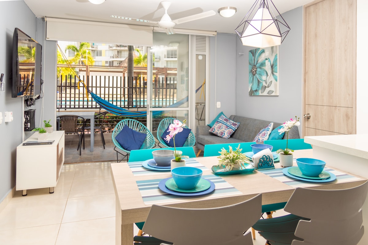 Apartament inteligent, cea mai bună piscină , caldă și complet nouă, cu design modern și tehnologie Alexa. 2 nișe confortabile, canapea extensibilă, bucătărie echipată, 2 băi elegante, televizoare inteligente și balcon cu vedere la cel mai bun apus de soare din Ricaurte. Piscină, grătar, terenuri și parc. Locație excelentă. Ideal pentru cei care caută lux, confort și cel mai bun preț. Un loc care are totul pentru odihna ta perfectă! Cea mai bună alegere cu cel mai bun preț