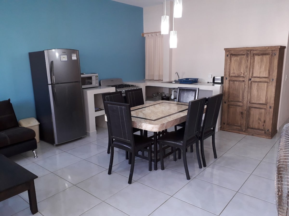 Acest condominiu spațios de lux de 100 de metri pătrați, complet independent și privat, ca o casă normală, este situat la 1 stradă de frumoasa plajă din guayabitos,confortabilă,spațioasă și echipată cu tot ce ai nevoie pentru a te odihni și relaxa cu liniștea zonei rezidențiale, are, de asemenea, o piscină și șezlonguri pentru a te bucura de climatul regiunii,cu o grădină și un grătar pentru carnea prăjită și instalarea pentru a-ți pune hamacul.