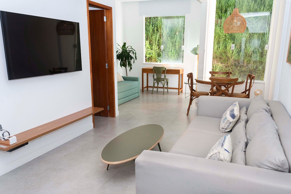 Amplo sala e quarto varanda, decorado, totalmente equipado Internet fibra optica alta velocidade, Wi-Fi, 2 smart tv's. na sala 55" no quarto 46", sala com ventilador de teto sofá cama, quarto cama de casal, ar condicionado split, agradavel escritorio impressora, cozinha americana geladeira,fogão, micro ondas, torradeira, liquidificador, máquina Nespresso, utensílios,secador de cabelos,máquina de lavar roupas,ferro e tabua de passar roupas,charmosa varanda com vista lateral da praia e piscina.