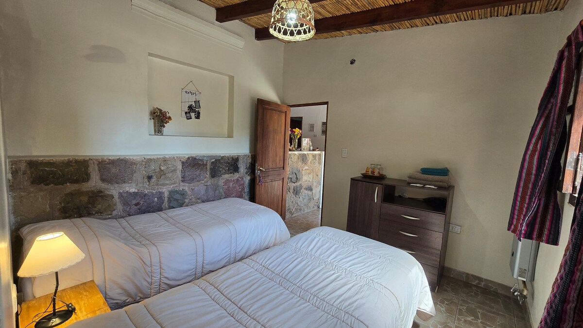 Cabană de familie cu un dormitor, bucătărie utilată, baie privată, Wi-Fi, parcare, grădină, grătar, curte pavată și terasă. La 10 străzi de centrul orașului, într-un spațiu verde și liniștit, la câțiva metri de situl arheologic Pucara de Tilcara
