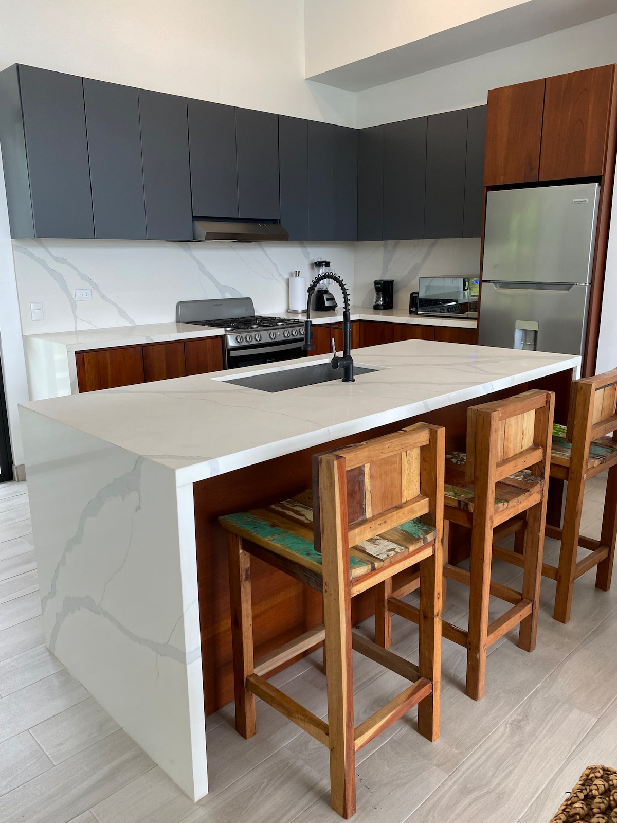 Amplasat de-a lungul malurilor imaculate ale râului Sevegre, Unicorn Chalet întruchipează luxul de cinci stele. Răsfață-te cu saltele Serta încălzite somptuoase, disponibile atât în dimensiuni King, cât și Queen, înconjurate de un decor elegant care emană căldură și sofisticare. Baia opulentă și bucătăria complet utilată îți îmbunătățesc șederea, în timp ce sistemul audio Harmon Kardon și iluminatul încântător creează o ambianță intimă. Acest refugiu rafinat promite o experiență de neegalat pe malul râului, unică în San Gerardo