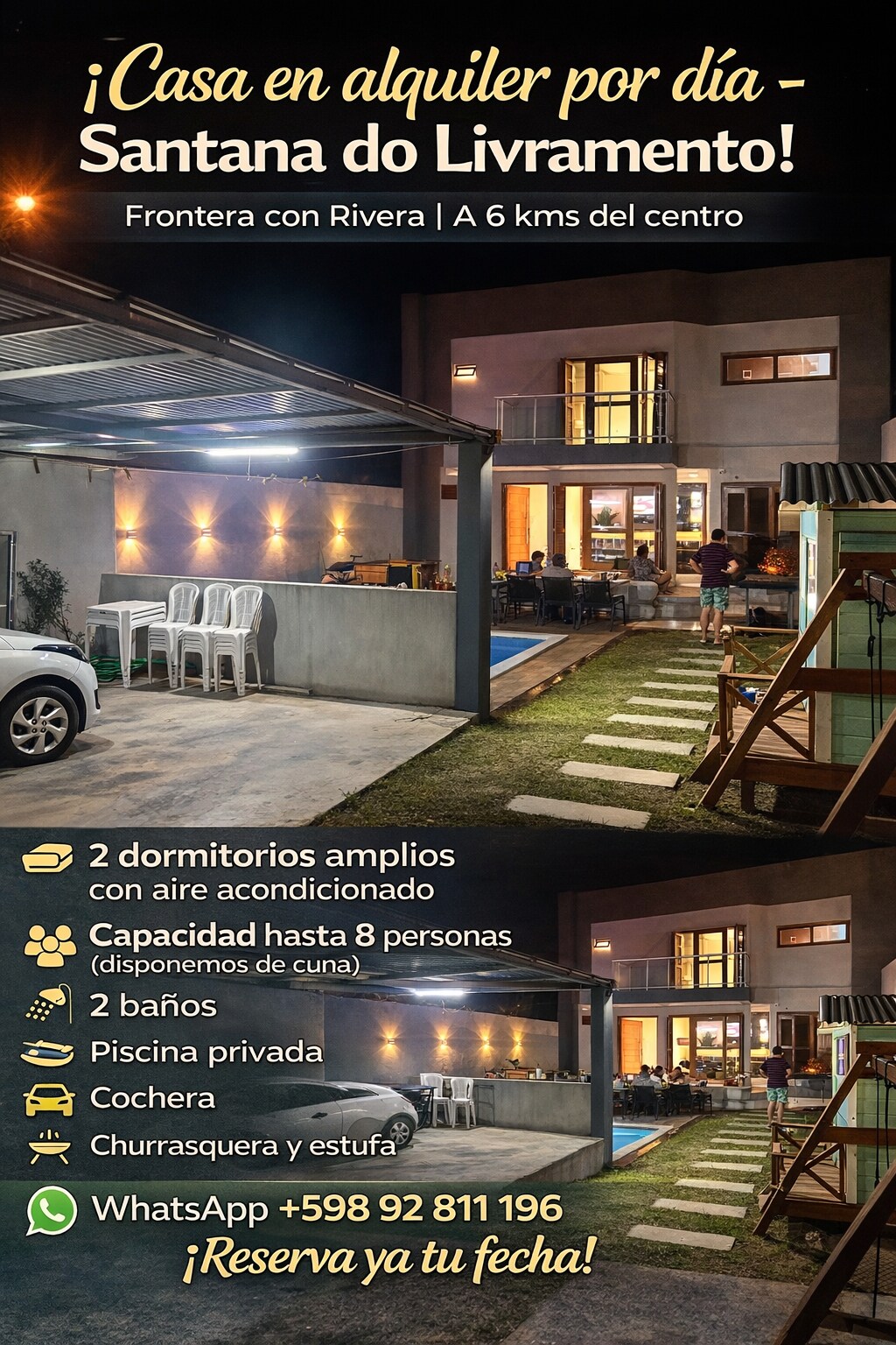 Casă spațioasă și bine situată în inima orașului Santana do Livramento, aproape de magazinele libere, baruri, restaurante și la doar câteva minute de Rivera (Uruguay). Găzduiește până la 6 persoane, cu 3 dormitoare, 2 băi complete, 2 livinguri, șemineu, bucătărie utilată, grătar și 2 locuri de parcare. Totul este pregătit pentru o ședere confortabilă și practică.