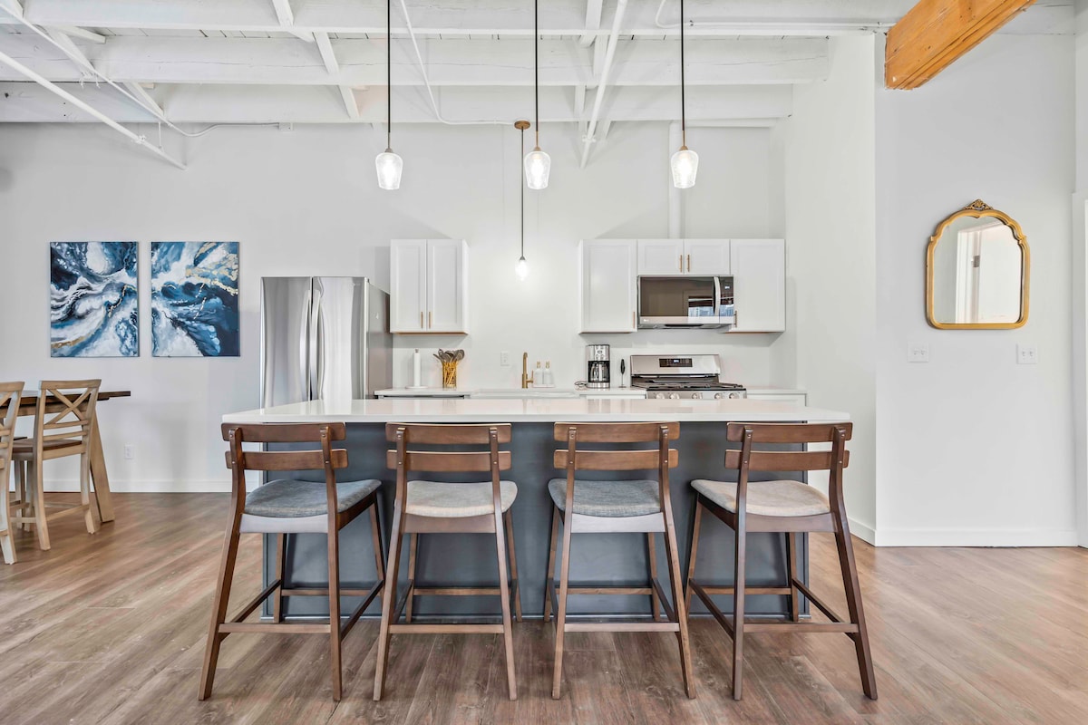 Welcome to the Sunflower Suite in KC's 'Little Italy' A stylish loft with skyline views just minutes from Downtown KC! - WALK to local restaurants & Bars - SCOOTER to a concert at T-mobile Center - UBER to a Chiefs / Royals game 5 min walk to Garozzo's (best Italian in KC) 5 min drive to Power & Light District 4 min drive to the Riverfront & CPKC Stadium Amenities: Laundry In Unit Natural Light (Large Windows) Fast Wifi King Bed Rain Shower Games Coffee/Tea station Kitchenette