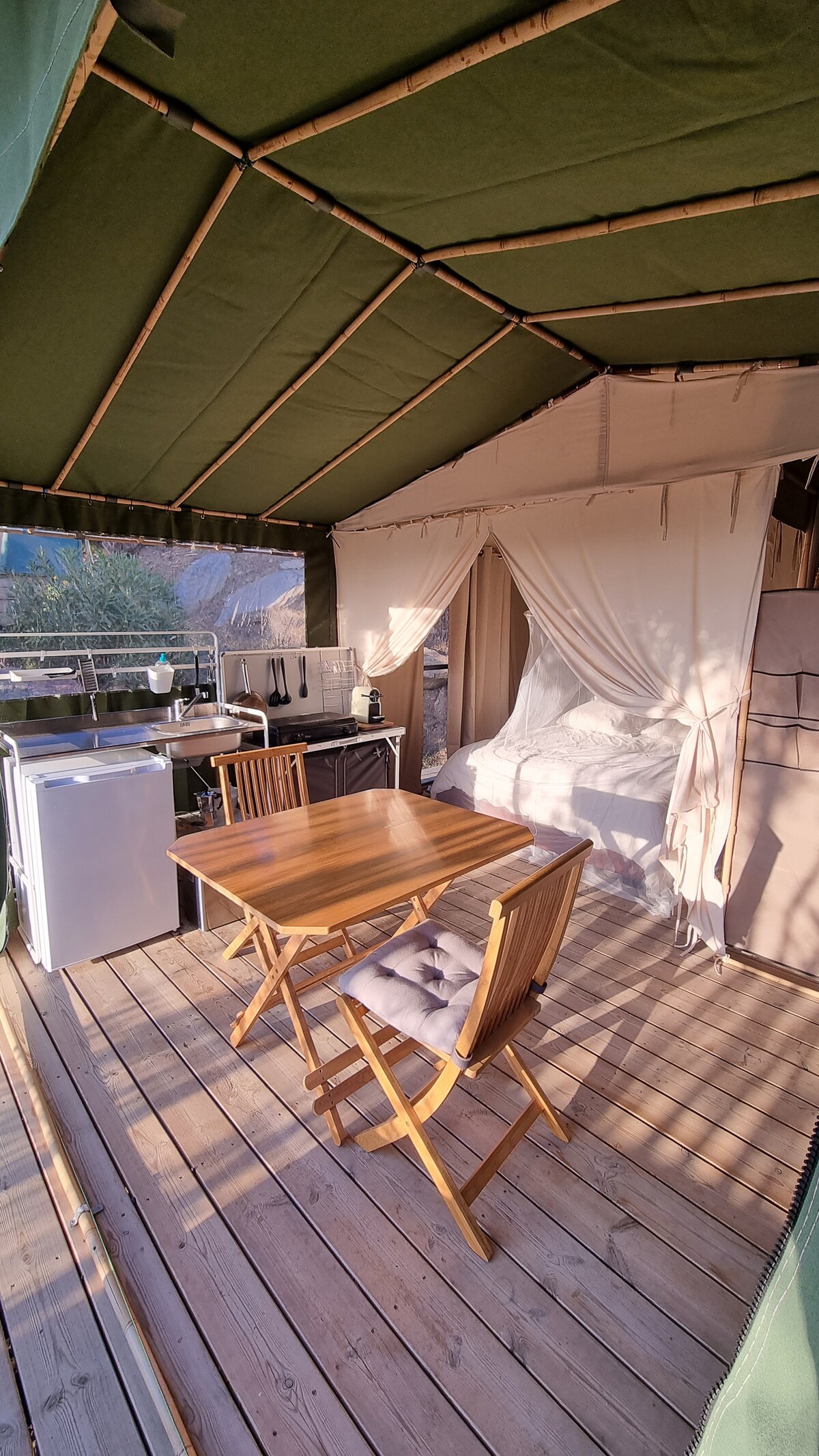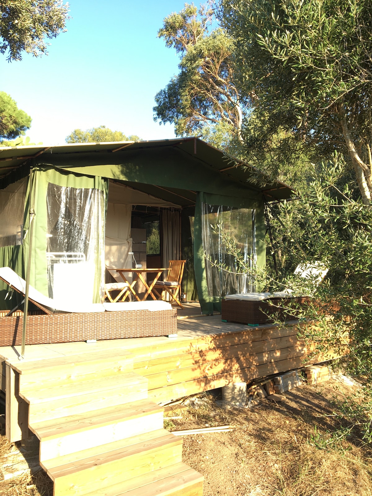 Lasă-te tentat de o noapte neobișnuită într-un cort confortabil de safari, cu o cadă cu hidromasaj privată și vedere la mare. Stai într-un spațiu privat cu terasă și cadă cu hidromasaj încălzită. Mic dejun inclus. În inima activității noastre de BIGARADIERS, care nu este trecută cu vederea, în ciuda apropierii de casa noastră, ai independență totală, intrare și spațiu privat. Vedere de neuitat la mare a golfului. Spațiu de parcare gratuită Baie mică confortabilă, duș și toaletă tradițională