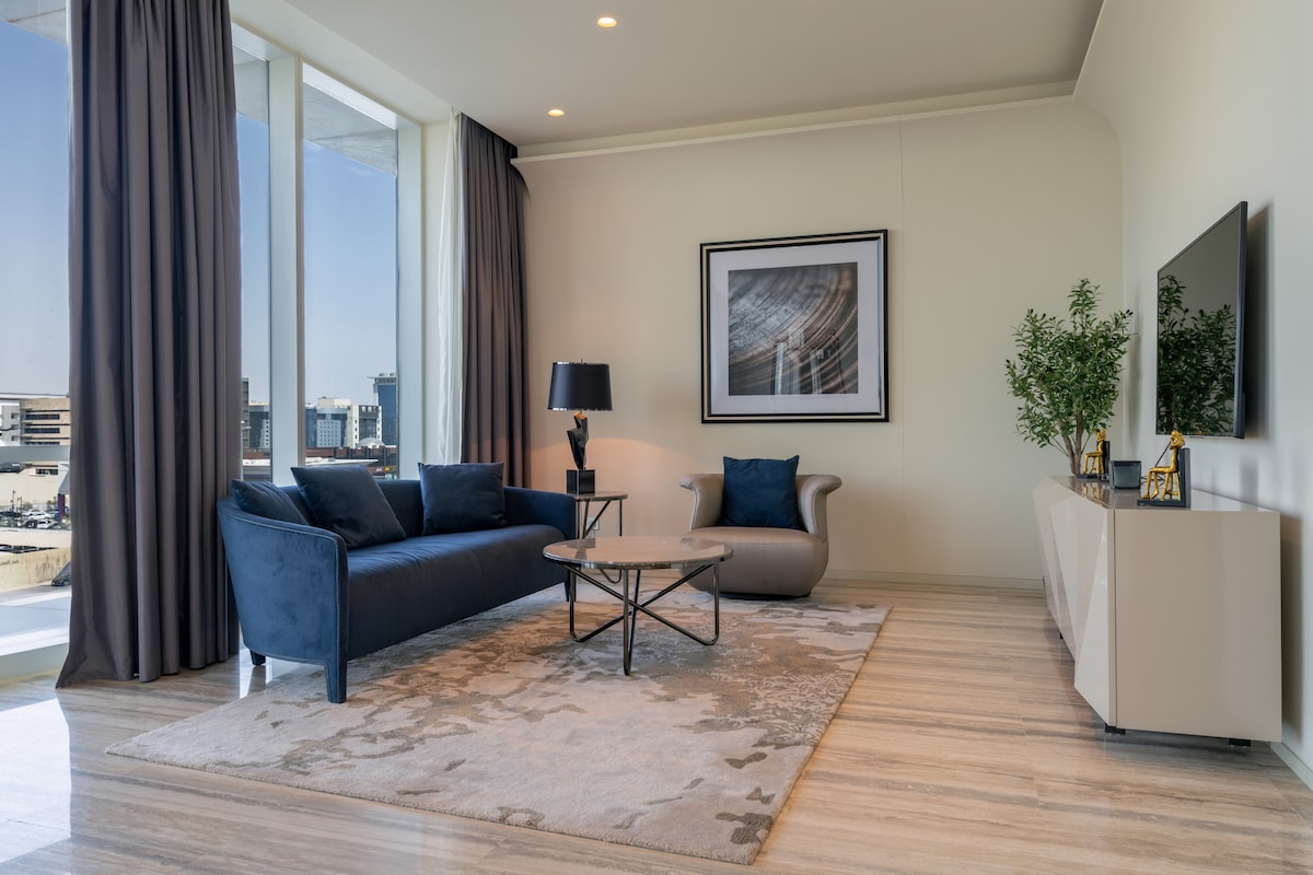 Apartment in Burj Rafal (owner's residence), 50+ floors, a northern view, for those looking for quiet and distinguished accommodation, near the most prominent landmarks of Riyadh. Fully equipped, designed and furnished with luxurious personal furniture; includes a bedroom with a master bed, a kitchen, (2) bathrooms. cinematic lighting, a washing machine, coffee machine, a 75-inch TV & large screen in the bedroom, air purifier filter, Kitchen tools to spend a period of stay in complete comfort.