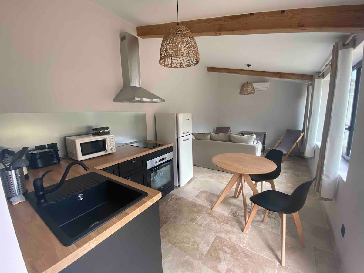 Mas restaurare . Veți avea un living mare cu bucătărie deschisă în sufragerie. La primul etaj o cameră mare pentru 2 adulți și o cameră mică pentru un copil, aveți la același nivel o baie cu cadă, precum și o toaletă separată Nu vei fi insensibil la mobilier și decor. Poți beneficia de terasă și poți beneficia de piscină