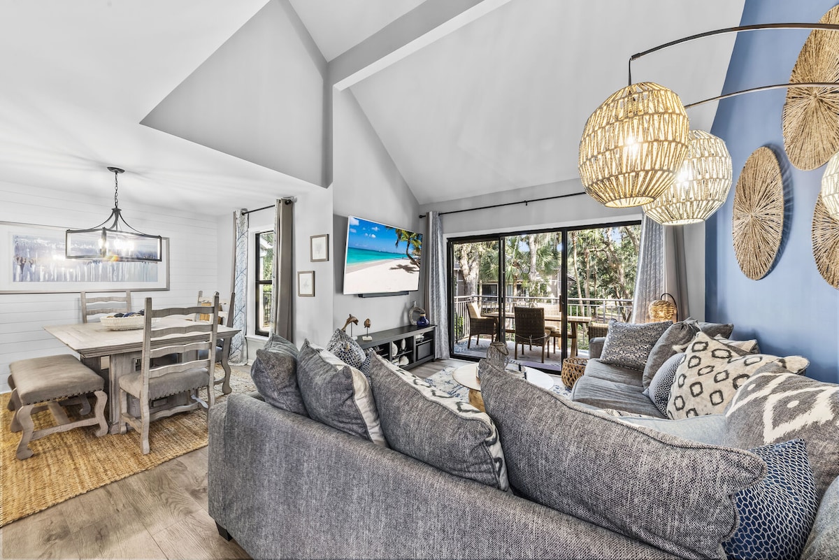 Stunning villa w/ beautiful view of 7th hole & 15 min walk to beach. Completely renovated with open kitchen and living space that leads out onto private deck. Deck includes lounge chaise and table to enjoy your morning coffee or dinner. Living space includes a pull out couch and a Samsung HD tv. Upstairs enjoy a bright and spacious bedroom with lofted ceilings. With purchase of amenity cards guests enjoy access to Islands world class facilities including: beach club pools, custom gym and more.