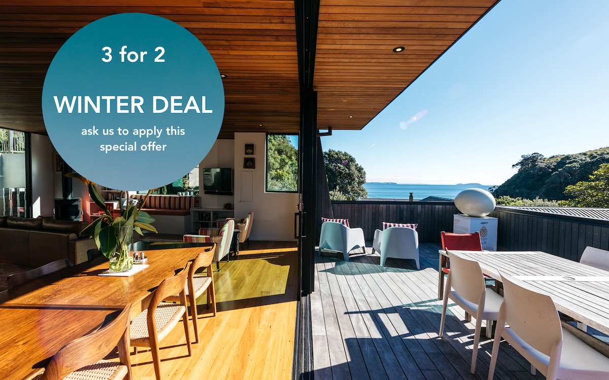 ** WINTER DEAL - Stay 2 or more nights and get a night free for stays taken between 1 May and 30 September 2026 (excluding holiday weekends)** Onetangi Beach Stays Apartment Experience the pinnacle of coastal elegance on Waiheke Island! From your expansive sun drenched deck enjoy glimpses of the shimmering ocean, just a heartbeat away from the pristine white sands of Onetangi Beach.