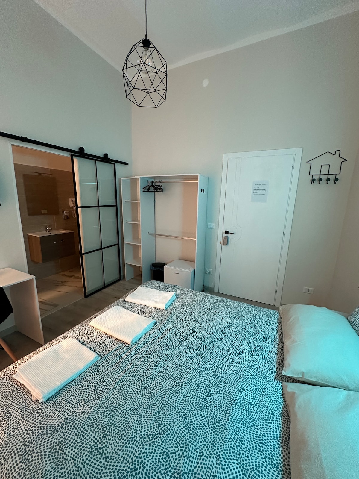 La camera è dotata di un comodo letto matrimoniale, bagno privato e arredi moderni e funzionali. Arredata in modo essenziale e funzionale, la stanza include comodini, lampade per lettura, scrivania, frigo, tavolo, macchina da caffè con cialde, bollitore, TV, aria condizionata e connessione Wi-Fi. Tutte le aree della camera sono accessibili, con bagno privato e marciapiede esterno.