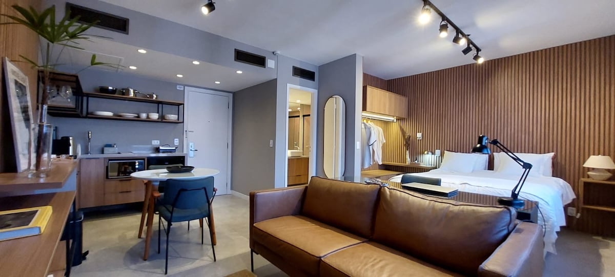 Apartamento recém reformado em flat com excelente localização. Espaço com cozinha equipada, enxoval de altíssima qualidade, cama deliciosa, 2 pias e 2 chuveiros. Espaço para trabalhar, internet particular de alta velocidade, TV smart 65” e Alexa (pontos de iluminação inteligente) hóspede terá acesso à piscina, sauna e academia. Estacionamento cortesia. Hotel conta com serviço de café da manhã. (40R$/pessoa) entretanto há diversas opções na região, distância a pé. A 900m do metrô Trian-Masp!