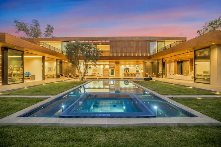 Întinzându-se pe un plan de amploare, locuința are 5 dormitoare spațioase și 9 băi somptuoase, perfecte atât pentru viața intimă, cât și pentru divertismentul la scară largă. Călătoria începe printr-o ușă pivotantă impresionantă din sticlă, întâmpinată de un perete verde interior de 3 metri, coloane elegante îmbrăcate în cărămidă și tavane înalte din lemn de esență tare. Bucătăria de ultimă generație este visul unui bucătar, cu insule duble de marmură, dulapuri din stejar, aparate Wolf și Subzero de top și două cafetiere Miele. Bucătăria se îmbină perfect cu zona de living dramatică cu două etaje, completată cu o scară plutitoare personalizată care conectează toate nivelurile acestei minuni arhitecturale. Concepută pentru a îmbina viața interioară și exterioară, locuința se mândrește cu uși Fleetwood de 50 de picioare care se deschid spre terenurile amenajate meticulos, oferind o piscină și un spa cu margine zero, o bucătărie în aer liber, o groapă de foc, măslini și mai multe zone de relaxare, toate amplasate în fața unor priveliști panoramice uluitoare. Facilitățile de primă clasă includ un cinematograf privat, o sală de gimnastică complet utilată, o saună cu sare din Himalaya, dușuri cu aburi duble, un display de vin cu temperatură controlată, trei balcoane private și un sistem de casă inteligentă Crestron. Curtea cu acces auto, căptușită cu stejari maturi, adaugă nota finală acestei proprietăți unice. Această reședință extraordinară oferă un nivel de sofisticare de neegalat, situată într-una dintre cele mai exclusiviste locații din Beverly Hills. O oportunitate de neegalat pentru cei care caută luxul suprem.
