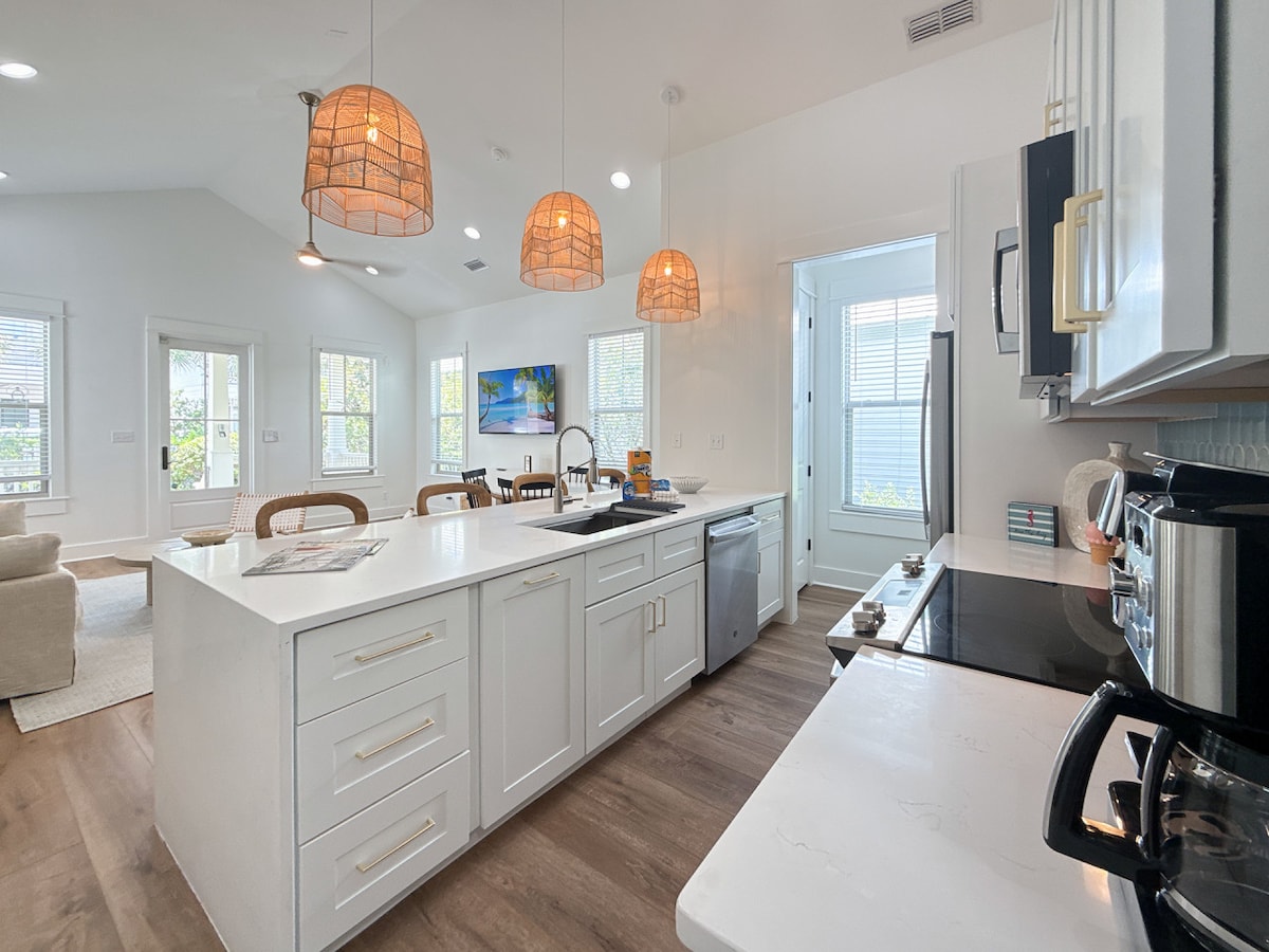 Vrei o experiență de coastă adevărată? Vibe nu este doar o altă închiriere de plajă învechită. Este o experiență de viață de coastă! Designerul Vibe are tavane shiplap realizate manual și mobilier artizanal local vopsit manual creează o senzație de cabană pe plajă care încălzește sufletul. Du căruciorul de golf gratuit cu 6 locuri inclus prin fermecătorul cartier Vibe până la plaja cu nisip de zahăr în mai puțin de 3 minute. Apoi întoarce-te acasă pentru a te relaxa în piscina privată încălzită sezonier și în cada cu hidromasaj.