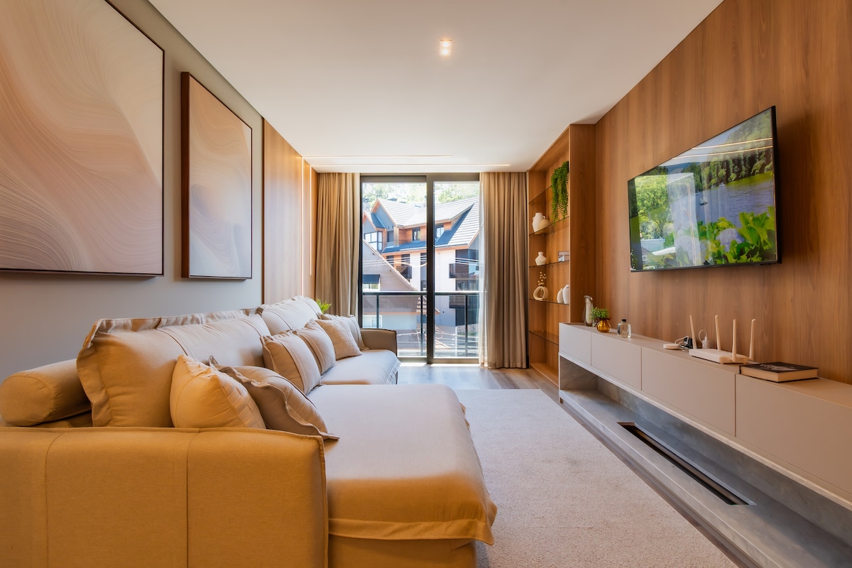 🍁Venha se divertir na Serra Gaúcha e hospede-se neste flat sofisticado em Canela com vista espetacular da Catedral de Pedra. Cozinha equipada, lareira aconchegante e quarto iluminado naturalmente. Acomoda até 4 pessoas + 1 criança (até 2 anos). Wi-Fi, Smart TV e ar-condicionado. Prédio com piscina aquecida, sauna, playground e academia. A apenas 5 min de restaurantes, cafés e atrações. Perfeito para casais e famílias que buscam conforto e charme 🍂