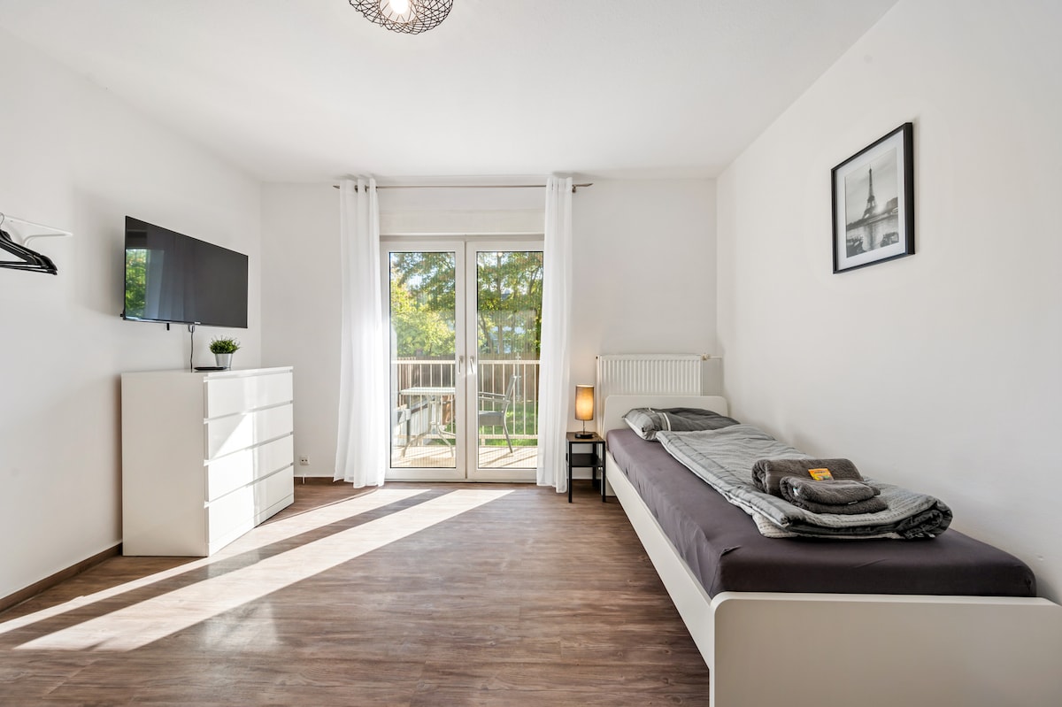 Relax in our spacious, 4-room ground floor apartment! With a bedroom with double bed, a room with two single beds and a sofa bed in the office, it can accommodate up to 6 people. The 100 square meter apartment also features a balcony and a yard for additional outdoor relaxation. Ideal connection to Frankfurt City and Frankfurt Airport by bus (5-10min walk) Supermarket 5min walk
