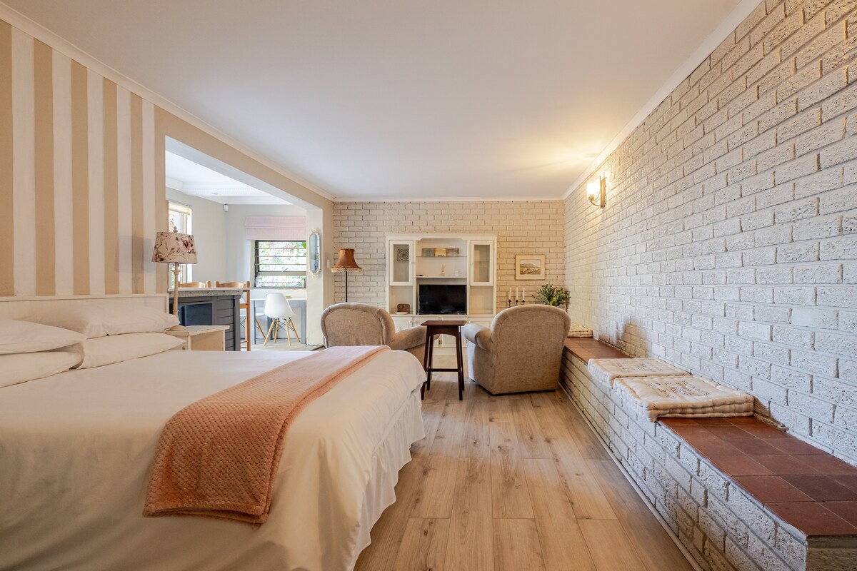 Un spațiu de locuit interior-exterior liniștit, ideal pentru cupluri sau persoane care călătoresc în interes de afaceri. Studioul elegant se deschide spre o terasă mare cu braai. Bucură-te de verile noastre lungi în aer liber! Garsoniera are o intrare separată de casa principală. Pat matrimonial cu duș deschis și toaletă separată. Are fibră WI-FI, DSTV complet, o chicinetă mică cu facilități de ceai/cafea, prăjitor de pâine, cuptor cu microunde, frigider și plită cu inducție unică. Parcare securizată la fața locului. Avem 2 câini mici pentru securitate suplimentară.