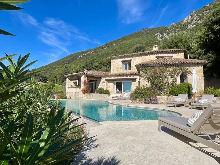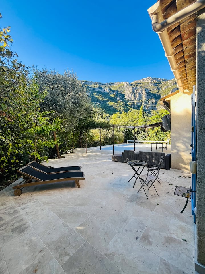 Les Figuiers, grădină/piscină cu vedere la munte.