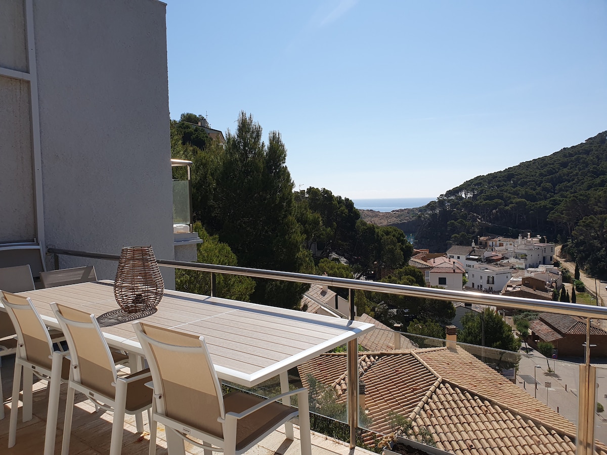 APARTAMENT NOU PLAJĂ AIGUABLAVA 100 m² + terasă mare 2 apartamente + lounge spațios + bucătărie + sufragerie + verandă. Vedere imbatabilă la mare și ACCES PRIVAT pe jos la o plajă, la doar 3 minute de mers pe jos sau 1 cu mașina până la Aiguablava–Begur. Fără clădiri în față, doar natură și Marea Mediterană. Aer condiționat, Wi-Fi, parcare privată. Proiectat de arhitectul Antoni Bonet și COMPLET RENOVAT. Aiguablava, cu ape turcoaz, este unul dintre cele mai exclusiviste locuri din Costa Brava. La doar 1h30 de Barcelona.