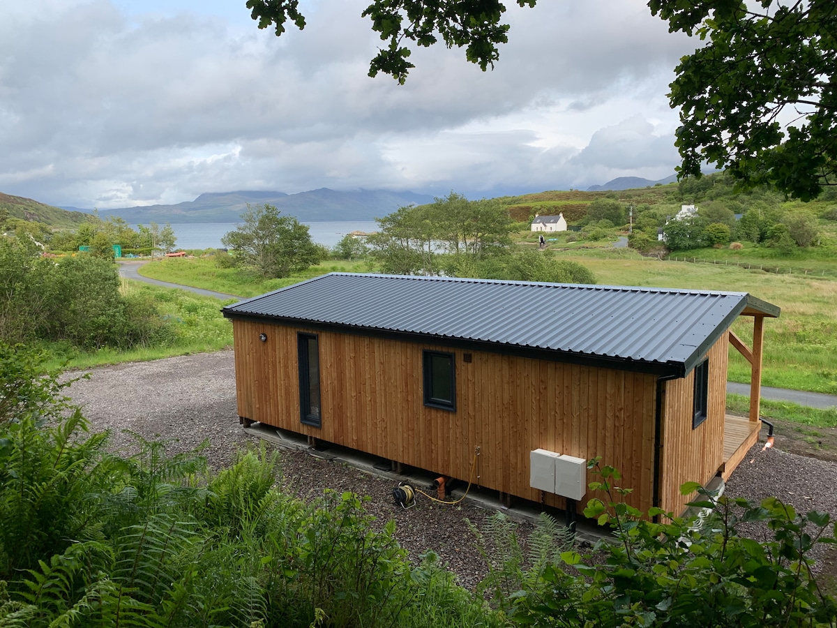 Cabana se află într-o pădure matură, cu priveliști uimitoare peste sunetul orașului Sleat până la dealurile maiestuoase Kintail și Knoydart, cu farul emblematic Stevenson construit în Isleornsay în prim-plan. Hotelul Eilean Iarmain, mereu popular, cu barul său Am Praban, se află la zece minute de mers pe jos.