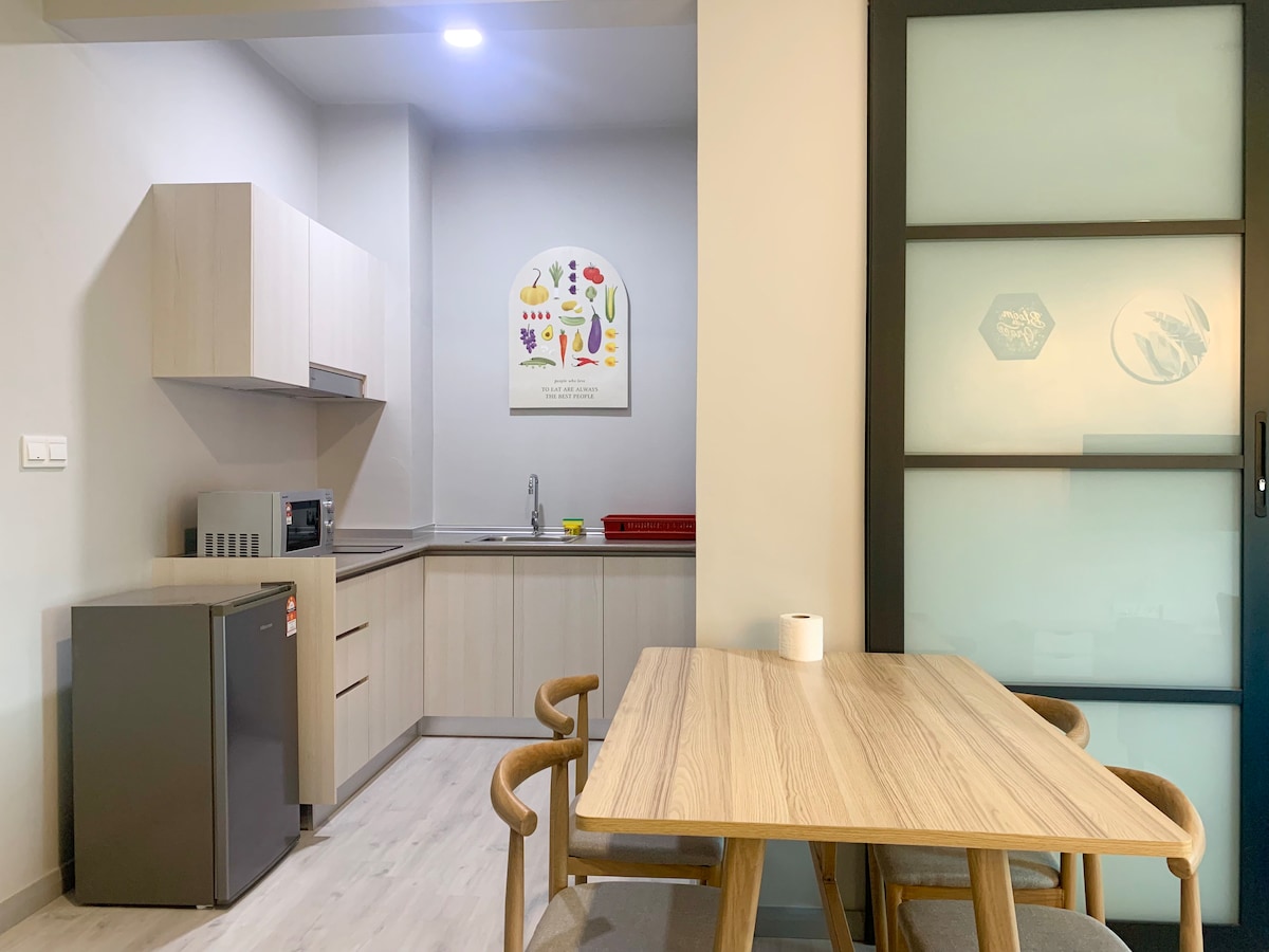 Totul este nou, chiar și clădirea în sine, mobilierul, dotările și locul sunt complet curate. Situat în jurul zonei orașului, acest loc este perfect pentru un cuplu care merge în luna de miere sau pentru un cuplu cu un copil. Locuință super confortabilă, cu toate dotările de care ai nevoie, bucătăria este complet echipată cu cuptor cu microunde și aragaz cu inducție etc. Sunt disponibile mașină de spălat și uscător automat de rufe. Practic, tot ce ai nevoie este aici. Wi-Fi de mare viteză! RM40 pentru pat suplimentar la 5 minute de mers pe jos de Imago Mall 7-10 minute de mers cu mașina până la aeroportul KK