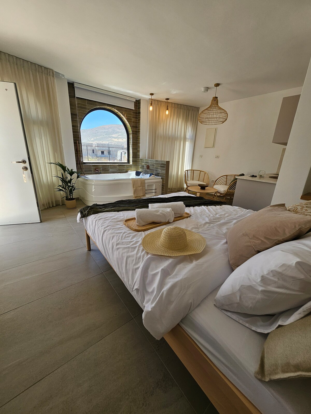 Suită premium – apartament autentic, foarte spațios, construit din pietre de bazalt originale și tavan înalt autentic. Apartamentul a fost proiectat într-un stil vechi - nou pentru o experiență excepțională. Apartamentul are 2 camere – un living cu jacuzzi și un dormitor. În plus, există o terasă privată cu care se confruntă peisajul magic al Mării Galileii și frumusețea din Înălțimile Golan. Pat matrimonial dublu 160x200 cu un design special Ecran TV LCD de 32 inch 40 de canale prin cablu Baie, inclusiv duș și toaletă Mobilier și dulap pentru haine AC Wi-Fi Frigider Mini bar Un ceainic și un colț de cafea/ceai cu aromă Zonă mare de relaxare, inclusiv canapea de colț