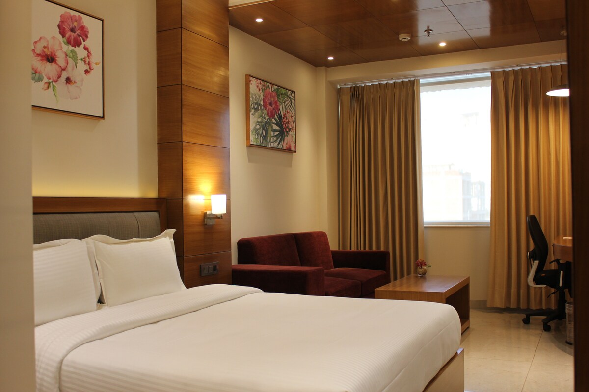 Located in the heart of Mohali. Nearby Locations: •1 min from Fortis Hospital •2 min International Cricket Stadium •5 min ISB Mohali •Only 10 minutes from the Airport Our Property Highlights: •Spacious Rooms – A fully equipped kitchen and a balcony •Presidential Suite – Featuring a separate meeting lounge for business •Fitness Center •Rooftop Restro – Enjoy stunning views of the city •Multi Cuisine resto 24/7 •High Speed Internet with 100 Mbps dedicated LAN in each room