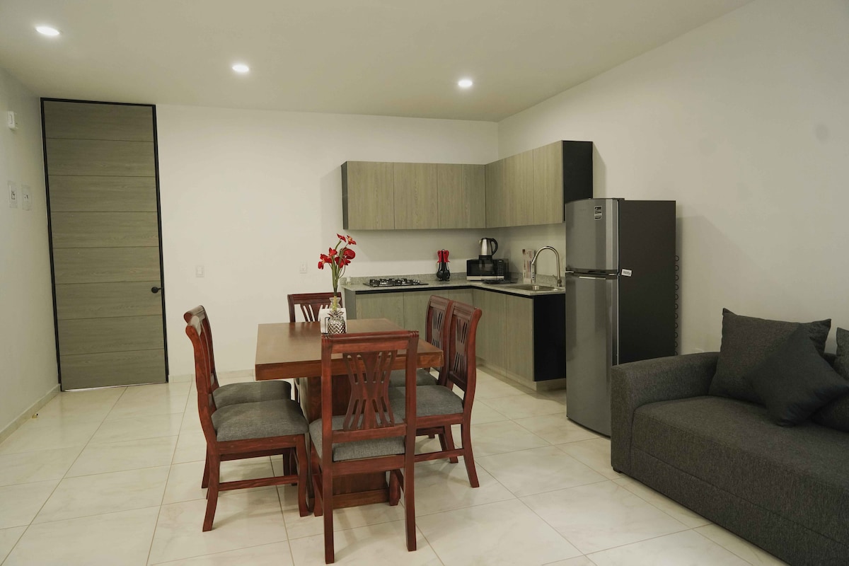 Apartament confortabil, complet echipat, la parter, pentru șederea ta la maxim Cu o locație excelentă, într-o colonie foarte liniștită și sigură, la 3 minute de centrul orașului. Are toate facilitățile, living, sufragerie, bucătărie cu ustensile, veselă și electrocasnice, două băi complete, două camere confortabile cu dulapuri mari, Wi-Fi și parcare în interiorul clădirii. Bucură-te de tradițiile, ospitalitatea, mâncarea bună și obiectele de artizanat din Sahuayo.