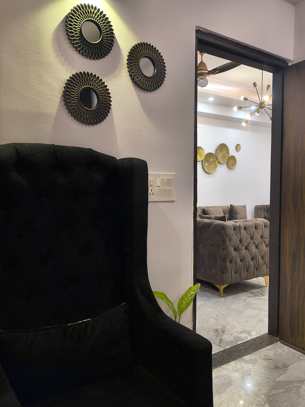 Bine ai venit în studioul nostru urban luxos, un sanctuar de stil și sofisticare în inima vibrantă a orașului Gurgaon. O caracteristică remarcabilă a loft-ului nostru este schema de culoare neagră de specialitate, care adaugă o notă de eleganță și dramă spațiului, făcându-ți șederea confortabilă și uimitoare. Pe măsură ce pășești în studioul nostru mobilat elegant, vei fi întâmpinat de fotoliile noastre rabatabile negre de pluș. Aceste două fotolii rabatabile de lux sunt elementul central, oferind un amestec perfect de design contemporan și confort excepțional.