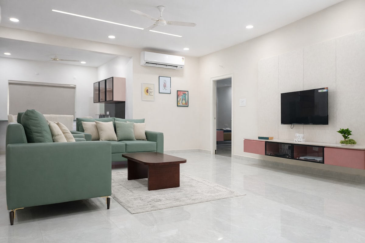 Bine ai venit la The Terrace, un apartament modern cu 2 dormitoare într-o zonă liniștită, verde și foarte sigură. Perfect pentru familii, cupluri și persoane singure. Locuința se află la 30–35 de minute de aeroport, cu acces facil la Uber, Ola și restaurantele din apropiere. Toate aplicațiile majore de livrare a mâncării funcționează fără probleme și suntem bucuroși să împărtășim recomandările noastre de top. Ești la 20–25 de minute de GVK Mall, la 2 minute de cel mai apropiat spital, chiar lângă un parc minunat pentru plimbări de dimineață sau de seară. Check-in independent pentru confort complet în timpul șederii.