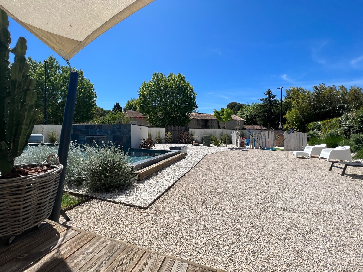 110m2, două dormitoare mari independente cu băi proprii, o spălătorie, bucătărie, canapea extensibilă, sală de jocuri/masă de foosball sportivă... Piscină și vegetație în aer liber pe +200m2 pentru a te bucura de grătar și terase umbrite. Aproape de rețeaua de transport, ideală pentru a vizita Avignon, L’Isle sur la Sorgue și festivitățile lor fără a utiliza vehiculul tău.