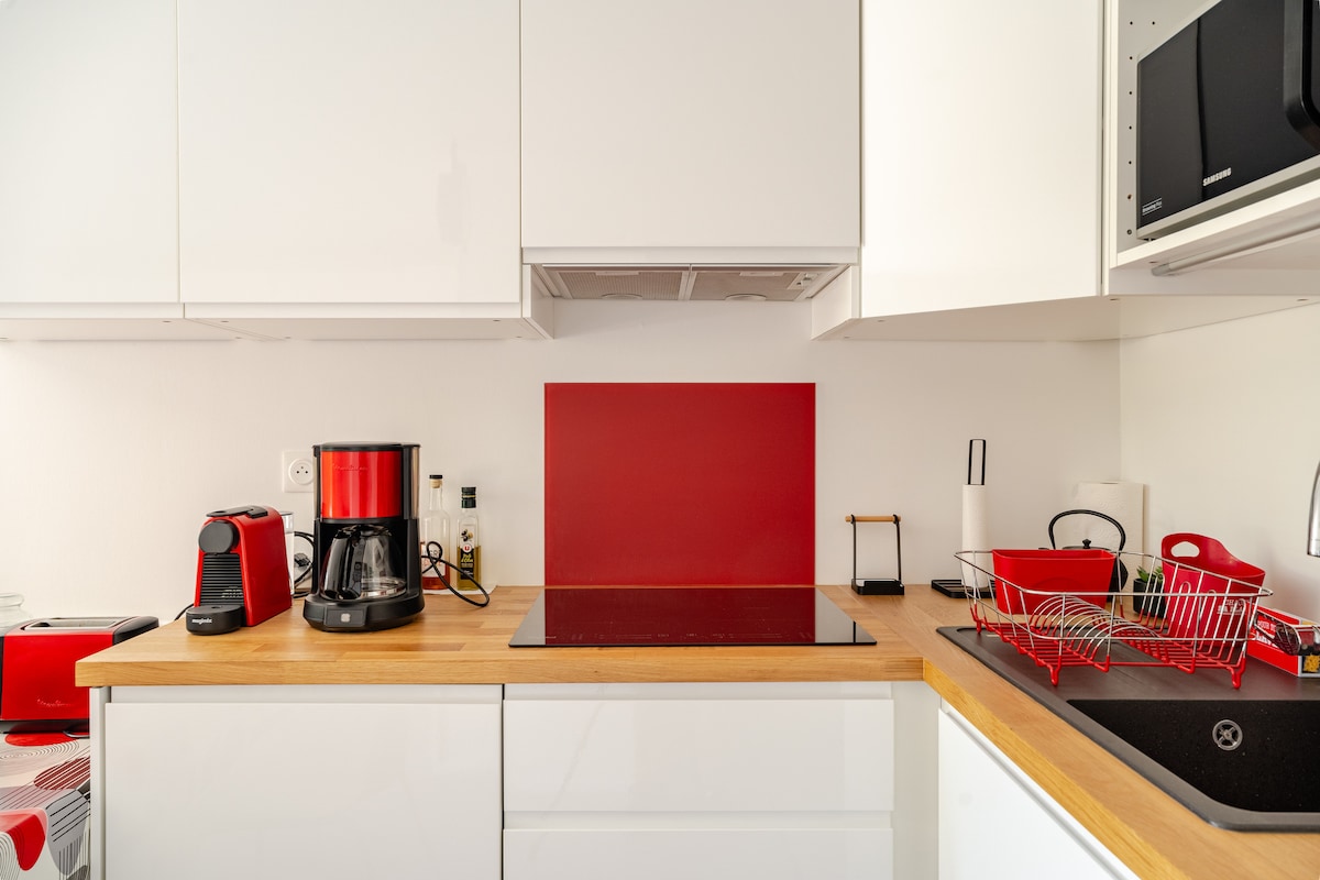 LENJERIE DE PAT, PROSOAPE ȘI PROSOAPE DE BUCĂTĂRIE FURNIZATE. Acest studio luminos ** de 25 m2 renovat, este situat la parterul reședinței, are o terasă de 10 m2 orientată spre sud, ideală pentru 2 persoane, poate găzdui 3 persoane, dar te vei simți mai puțin confortabil. Se compune dintr-o bucătărie complet utilată În living, două canapele rapide convertibile 160 x 200 și 140 x 190, TV lcd 82 cm, precum și spațiu de depozitare Baie cu duș și toaletă