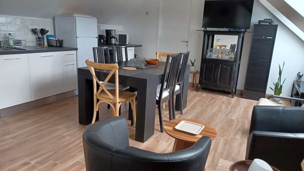La 15 minute de Laval, acest nou apartament la mansardă de 50 m2 se află la primul etaj al casei . Dispune de: - un living cu bucătărie utilată + o zonă de living. - un dormitor cu un pat dublu 140-190 + un pat de o persoană 120- 190 + un spațiu de birou dedicat. - o zonă separată de dormit cu o canapea extensibilă cu 2 locuri. - o baie + toaletă.