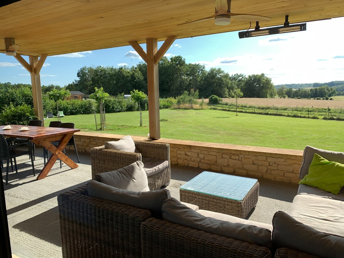 Bine ai venit în casa noastră superbă de la țară, cuibărită pe dealuri împădurite. Bucură-te de o vedere excepțională la 180° a Dordogne în timp ce înoți în piscina noastră infinită (deschisă numai din mai până în octombrie) sau în cada cu hidromasaj (disponibilă pe tot parcursul anului). Proprietatea noastră se află pe 4 acri de peisaj rural liniștit, în partea de sus a văilor înverzite Dordogne. Relaxează-te, bea un pahar de vin și privește cum baloanele cu aer cald se vopsește pe cer la răsărit sau la apus. Folosește bicicletele noastre pentru a explora regiunea sau grătarul de afară și a admira peisajul.