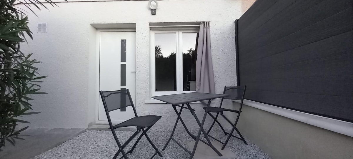 Studio de 25m2 attenant à une maison au calme, avec sa terrasse de 20m2. Un lit Queen size de 160/200cm, un secrétaire, une table et 2 chaises. Pas de télévision dans le studio. kitchenette équipée: plaque/cuisson; micro-onde;réfrigérateur/congel , cafetière Nespresso, vaisselle+produits d'entretien . Sanitaire indépendant: lavabo, wc, douche italienne. Terrasse équipée :1 parasol, 1 table 2 chaises et 2 transats. Wifi. Parking pour 2 véhicules fermé par portail automatique.