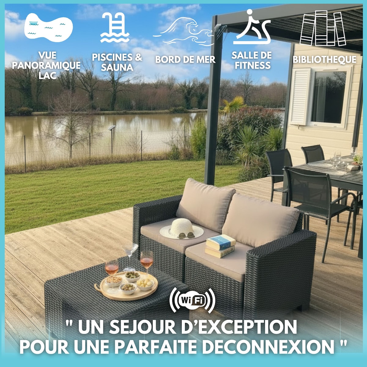 Situată într-o zonă liniștită, securizată, LA APROXIMATIV 300 M DE Lacul Jaunay, această cabană cu aer condiționat oferă un living, 2 dormitoare, baie, toaletă independentă, echipă de bucătărie, mașină de spălat, terasă acoperită și o a doua parcare în aer liber, 2 mașini. Vei avea acces la piscine interioare încălzite cu jacuzzi din aprilie până în octombrie și în aer liber, cu jocuri de apă și plajă de nisip de la mijlocul lunii iunie până la jumătatea lunii septembrie, locuri de joacă, zone de fitness în aer liber, pistă de bowling . 12 km de plaje, 15 km de Saint Gilles Croix de Vie
