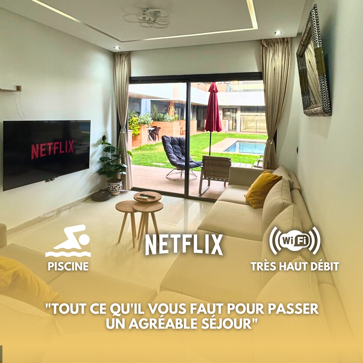 Apartament nou-nouț, fabulos, bine echipat, cu bandă largă prin fibră optică, Netflix, IPTV... liniștit și sigur. Acest apartament oferă momente de relaxare pentru întreaga familie, cu parcare gratuită la proprietate. 500 m de marele Carrefour Salé, magazine alimentare la o scurtă plimbare pentru a-ți face cumpărăturile. Aproape de Burger King,Nigiri House, Adidas, Fitness Park,coafor și hamam...200 m de mare, unde există cafenele cu vedere panoramică la ocean!Cu mare plăcere